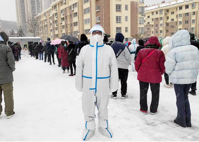 漫天風雪,氣溫低至零下,依然擋不住廣大志愿者抗疫的腳步。11月30日以來,集團黨員干部職工全力以赴投身在抗疫第一線,在抗疫戰場上“連軸轉”。有的干部職工雖然不是黨員,卻在關鍵時刻沖鋒陷陣,第一時間到社區報到,支援抗疫工作。有的黨員從12月1日晚上8點就開始在社區卡口執勤,一直干到次日凌晨1點,寒風刺骨卻無怨無悔。有的黨員老公在單位值守,自己一個人在家照顧孩子,為了支援社區疫情防控,早上5點就把孩子叫醒讓對門鄰居幫忙照看,義